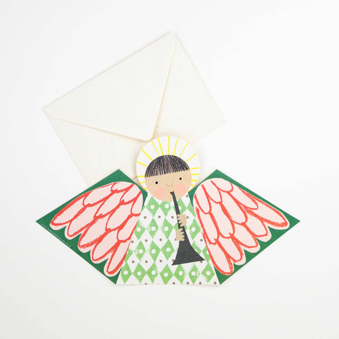 A sweet choir green angel card with fold-out wings so it stands beautifully on display. Printed on high-quality 300gsm card stock. Each card measures about 4 1/2" x 6" (11.5cm x 15cm) when folded and comes with an ivory envelope. The inside is left blank for your own message.