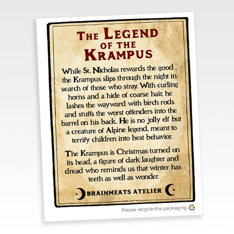 This mischievous Krampus card is made by our friends at Brainmeats Atelier in Ohio. The image is a reproduction of a vintage penny postcard (no doubt printed originally in Northern Europe). The image is printed on white cardstock. The card is blank inside for your own greeting, but a separate insert, which explains the Krampus legend, is included with the card. Comes sleeved with a red envelope. 5 1/2" x 4 1/4".