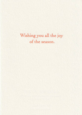 Letterpress printed boxed cards for the holidays from Saturn Press in Kent, Connecticut. Each color in the image is printed separately, by hand, as is the interior text, which reads "Wishing you all the joy of the season." The cards are 7" tall x 5" wide. A box of 8 cards on luxurious paper with 8 envelopes.