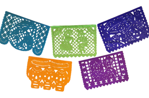 Traditional festive banners of paper cut with intricate designs. The cutting is done by hand with sharp chisels through as many as 50 sheets of paper at one time. This batch is made especially for Dia de Muertos with assorted iconic calavera imagery. Each individual banner measures 18" wide x 14" tall, and each span of multicolor banners is 15 feet in length. Hang them near the ceiling in a breezy room for a truly memorable effect. Handmade by artisans in Puebla, Mexico.