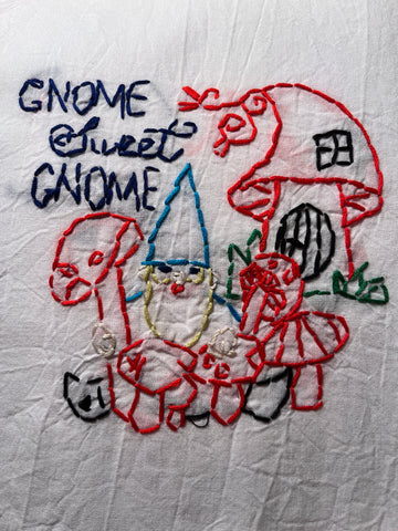 The mappini (or tea towels) in this series feature adorable gnomes (tomten in the Swedish tradition) and plenty of toadstools, too. The flour sack towels are always white, but Mom chooses the embroidery floss colors by her whim and each is made by hand, of course, so each towel is unique. Expect yours to look a lot like the ones you see in the photographs, but the colors may vary.