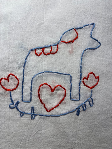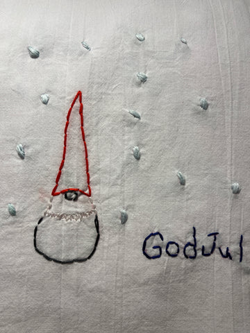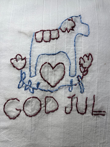 The mappini (or tea towels) in this series feature traditional Scandinavian yuletide imagery (and one dala horse you may use all year long; not just at Christmas). The flour sack towels are always white, but Mom chooses the embroidery floss colors by her whim and each is made by hand, of course, so each towel is unique. Expect yours to look a lot like the ones you see in the photographs, but the colors may vary.