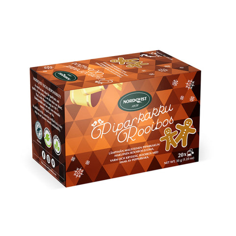 Nordqvist's Gingerbread Rooibos Tea is a warm and spicy blend of decaffeinated rooibos flavored with gingerbread, perfect to warm a cold winter's night. Box of 20 tea bags. 1.24 oz. Imported from Finland. Vegan. Rain Forest Alliance certified. One side of the box is printed in English, but here's your chance to practice Finnish, too!